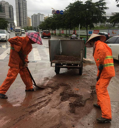 ▲環(huán)衛(wèi)工人清理暴雨過后積泥